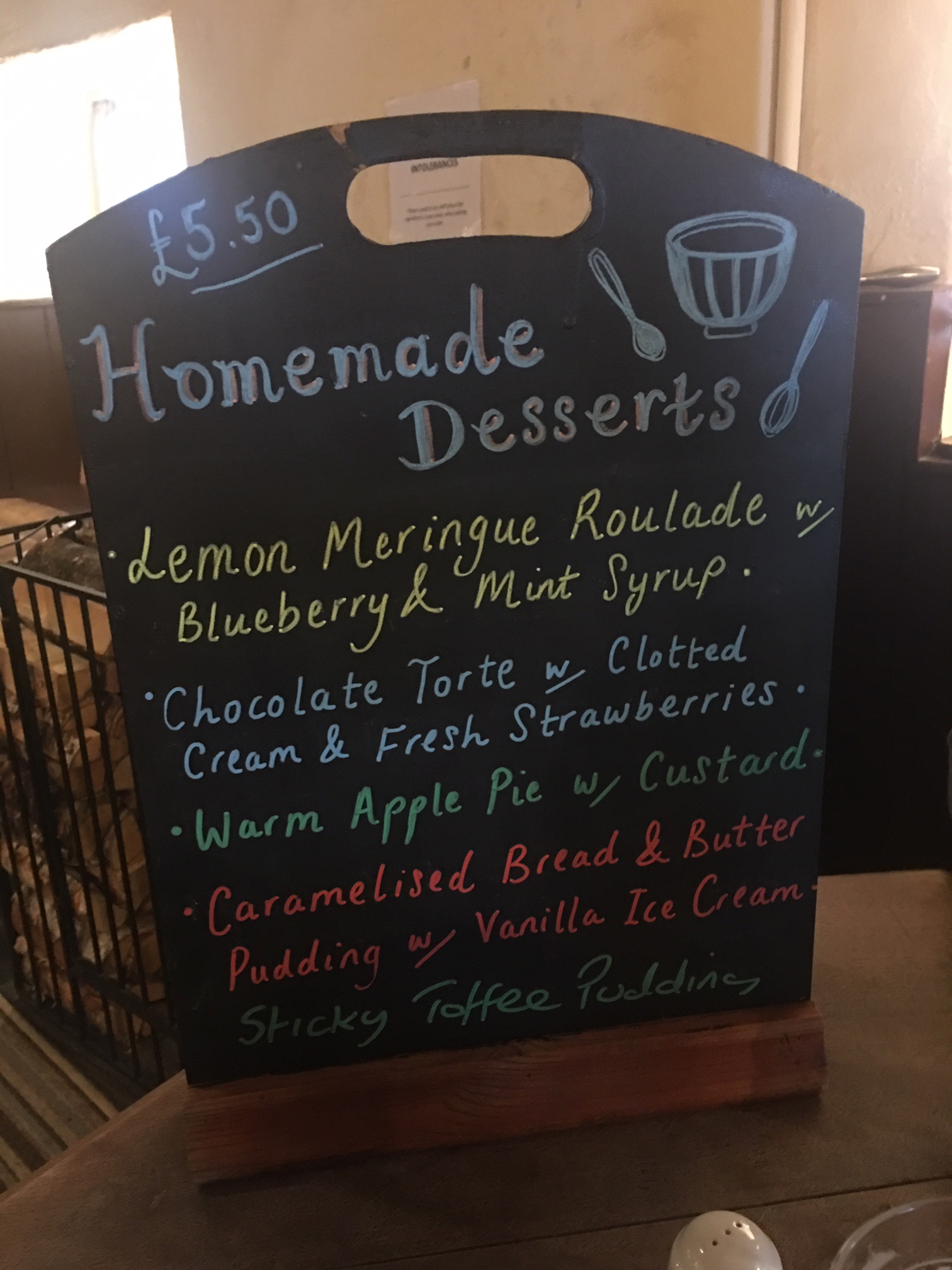 A portable chalk sign sat on an adjacent table, heralding homemade desserts for £5.50 each: “Lemon Meringue Roulade with Blueberry and & Mint Syrup; Chocolate Torte with Clotted Cream & Fresh Strawberries; Warm Apple Pie with Custard; Caramelized Bread & Butter Pudding with Vanilla Ice Cream; and Sticky Toffee Pudding.”