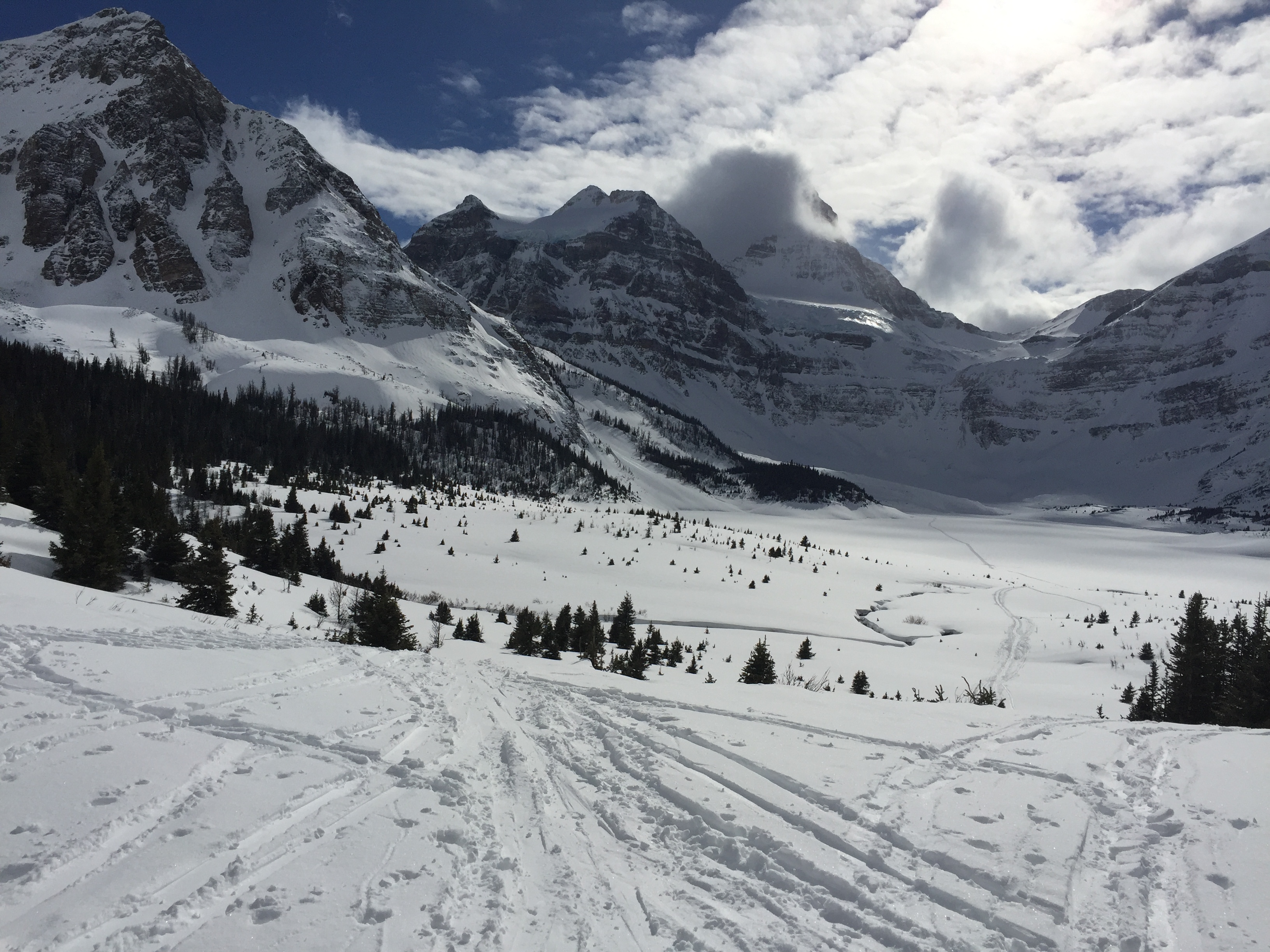 This strikes me as we labour at the edge of exhaustion across the dazzling white expanse that is Lake Magog, sitting in the shadow of Mount Assiniboine in the Canadian Rocky Mountains. This is the jagged peak that Europeans tagged the “Matterhorn of the Rockies” a century ago when they were trying to convince tourists to come to the New World.