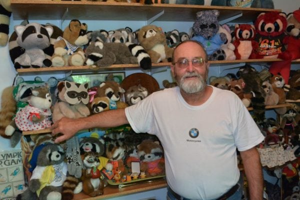 In the end, Simon says, spectators should remember the bikers are nearly all people just like them; one shouldn’t judge them based on how they look or what they wear. To illustrate, he takes his visitor out to the back of his home, into his “raccoon shack.” In it, the walls are lined with stuffed raccoon plush toys. “My wife collects them,” he says. “We have about 4,000 here and in the house.”