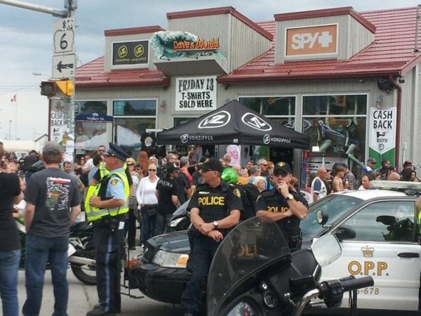 This notion of bikers and even outlaws keeping the peace during the event is one that was repeated by residents and business people who were interviewed. They also added that the OPP has a significant presence in town during the week. Sanchuk agrees that both aspects help to maintain order. In general, he says, “The bikers are very respectful.”